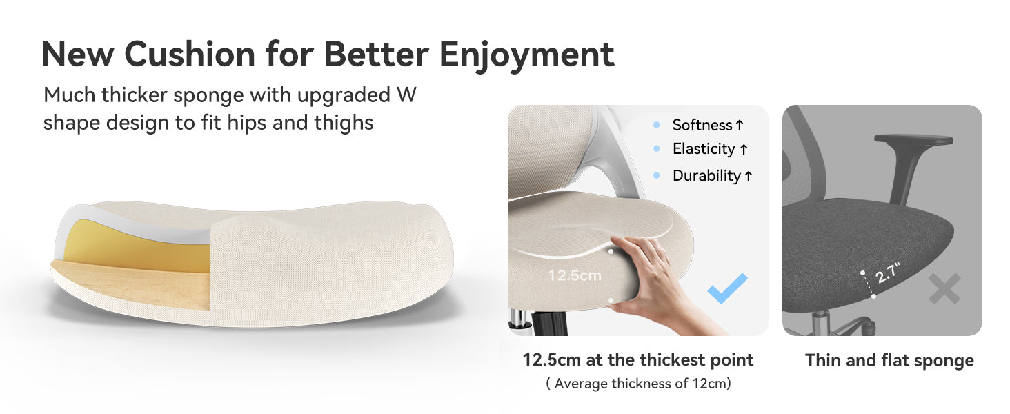 This desk chair's cushion uses a new 4.9'' thick memory foam. The saddle-shaped contour fits the curve of the hips and legs, increases the sitting area, and further disperses pressure caused by sitting for a long time.